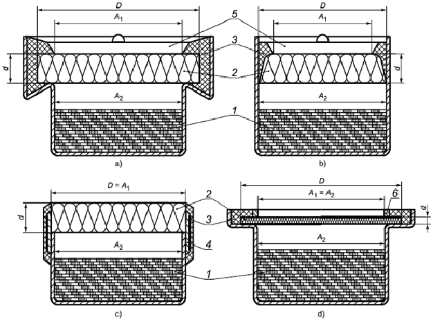 1 — влагопоглотитель/насыщенный водный раствор соли; 2 — образец для испытания; 3 — герметизирующий состав; 4 — герметизирующая лента; 5 — обойма; 6 — ограничительное кольцо; — верхний открытый участок образца; — нижний открытый участок образца; — площадь образца; — толщина образца; — среднее значение площадей открытых участков образца,