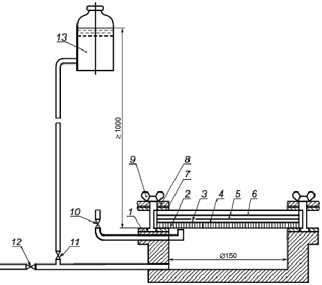 60 кПа; 7 — верхняя резиновая уплотняющая прокладка; 8 — стальной кольцевой зажим; 9 — гайка-барашек; 10 — воздушный выпускной вентиль; 11 — водяной впускной вентиль; 12 — вентиль для подачи и удаления воды; 13 — сосуд с водой для создания и поддержания давления до 60 кПа (давление регулируют высотой подъема сосуда с водой)