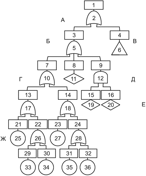 1 — система, не соответствующая спецификации или неработающая; А — завершающее событие; конечное событие; завершающий итог; 2 — отказ системы; 3 — отсутствие напряжения или неправильное напряжение; 4 — нет обработки данных или их неправильная обработка; Б — промежуточное событие; причина события следующего уровня; входное событие для события следующего уровня; итоговое событие, вызванное его входными воздействиями; В — событие, возникшее в другом месте дерева неисправностей; представлено графически вентилем переноса; 5 — источник питания; 6 — микропроцессор; 7 — нет питания от батареи; 8 — нет фильтрации питания от батареи; 9 — на выходе системы нет ни одного из двух сигналов; Г — вентиль ИЛИ как символ обозначает сочетание входных событий: появление того или иного события или состояния, вызывающего следующее событие или состояние; 10 — подача питания от батареи; 11 — фильтрация напряжения; 12 — выходы; Д — вентиль И как символ обозначает сочетание входных событий: появление обоих событий вызывает следующее событие; существование обоих состояний приводит к появлению итогового состояния; 13 — обрыв входного элемента индуктивности; 14 — сглаживающий конденсатор замыкает батарею на землю; 15 — нет сигнала на выходе 1; 16 — нет сигнала на выходе 2; 19 — выход 1; 20 — выход 2; Е — неразвиваемое событие; развито в другом АДН или осталось неразвитым из-за отсутствия информации или необходимости получения дополнительных данных; 17 — обрыв входной катушки индуктивности; 18 — короткое замыкание сглаживающего конденсатора; 21 — обрыв катушки индуктивности вызван ее случайным отказом; 22 — обрыв в схеме вызван производственным дефектом; 23 — короткое замыкание конденсатора вызвано его случайным отказом; 24 — короткое замыкание обусловлено производственным дефектом; Ж — базисное событие; 25 — обрыв компонента