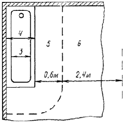 1-а — ванна; 2-b — ванна со стационарной перегородкой; 3 — зона 0; 4 — зона 1;