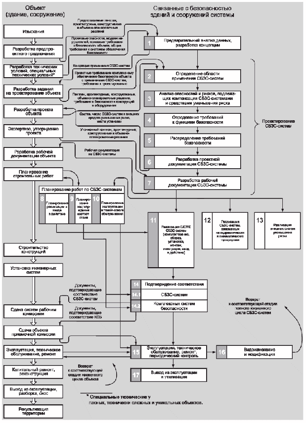 Безопасность зданий и сооружений обеспечивается применением совокупности мер, мероприятий и средств для снижения риска причинения вреда до уровня приемлемого риска и поддержания этого уровня в течение периода эксплуатации или использования объектов. К техническим средствам снижения риска относятся системы, связанные с безопасностью зданий и сооружений. Эти системы, состоящие из электрических и/или электронных компонентов, в течение многих лет используются для выполнения функций безопасности. Кроме них и вместе с ними используются системы, основанные на других (гидравлических, пневматических) технологиях, а также внешние средства уменьшения риска. Для решения задач обеспечения безопасности зданий и сооружений во все больших объемах используются программируемые электронные, т.е. компьютерные системы.