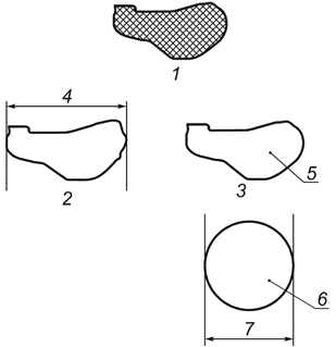 1 — действительное изображение частицы; 2 — изображение частицы по ИСО 4402 (распределение частиц ACFTD по размерам); 3 — изображение частицы по NIST, эквивалентный диаметр проекции (распределение частиц по размерам, полученное в NIST); 4 — размер наибольшей хорды