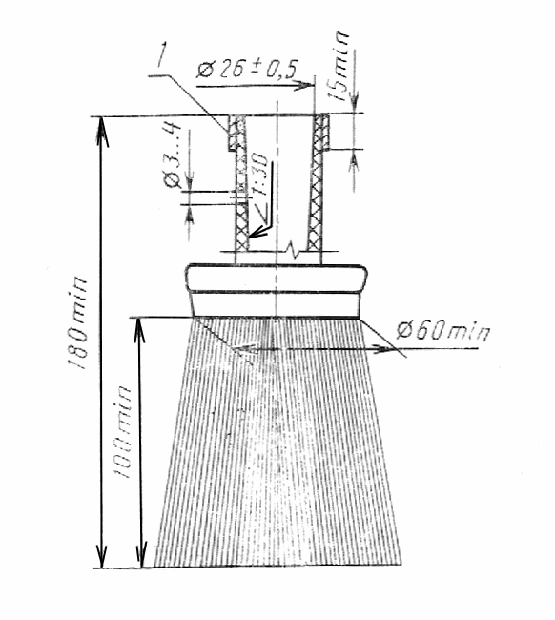 — пучок кисти или щетки диаметром 5 мм, выбранный в периферийной части кисти, вставляют в отверстие патрона и при помощи подвижного конуса закрепляют в нем. После этого кисть или щетку с указанным приспособлением устанавливают на разрывную машину, закрепляя в ней ручку кисти и приспособление, или используют динамометр и снимают показатели на машине или динамометре.