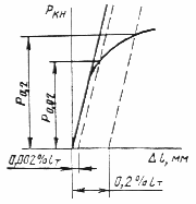 , на расстоянии от прямой части диаграммы в направлении оси абсцисс, равном для условного предела текучести 0,4 мм и для предела упругости 0,04 мм. В точках пересечения этих линий диаграммой растяжения определяем нагрузки Р0,2 и Р0,02, соответствующие условным пределам текучести