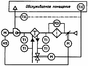 Пример выполнения принципиальной технологической схемы вентиляционной системы с указанием приборов, средств автоматизации и линий связи приведен в приложении В.