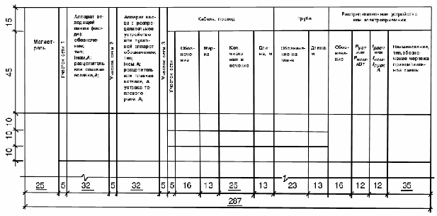 в графе "Магистраль" (форма 2) указывают буквенно-цифровые обозначения магистрали, ее координаты по плану расположения электрического оборудования (при необходимости), тип шинопровода и его номинальный ток (материал и сечение шин — для магистралей нетипового изготовления), напряжение;