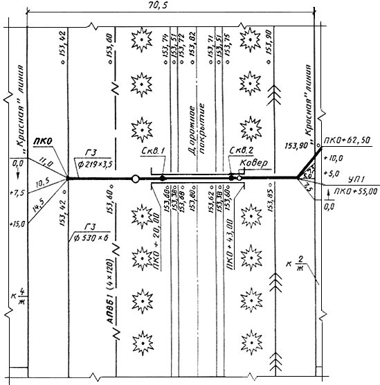 — пересекаемые автомобильные дороги, железнодорожные и трамвайные пути, кюветы, а также другие подземные и надземные сооружения в виде упрощенных контурных очертаний — сплошной тонкой линией, коммуникации, влияющие на прокладку проектируемых газопроводов, с указанием их габаритных размеров и высотных отметок;