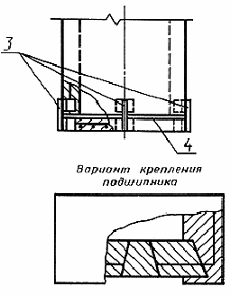 | 1 — опорные диафрагмы; 2 — подпятник; 3 — коротыши; 4 — цементный раствор; ц. т. — центр тяжести стойки;