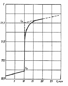 5.1.  По результатам измерений строят график зависимости температуры калориметра от времени в масштабе: 1С соответствует 100 мм по оси ординат, 1 мин соответствует 5 мм по оси абсцисс (см. черт.3).