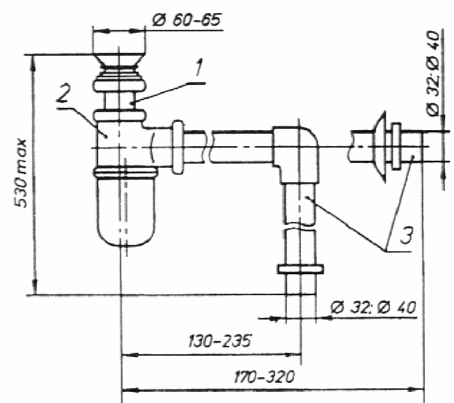 1 — выпуск; 2 — корпус сифона; 3 — отвод