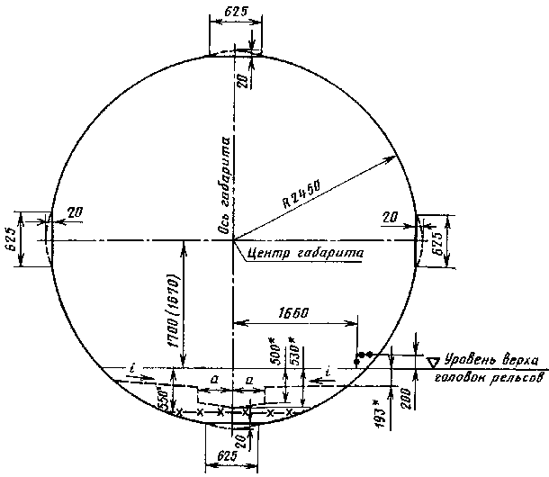 где 1700 (1670) — расстояние от центра габарита до точки, лежащей в плоскости касательной к головкам рельсов посередине пути, соответственно, при рельсах типов Р50 и Р65, мм;