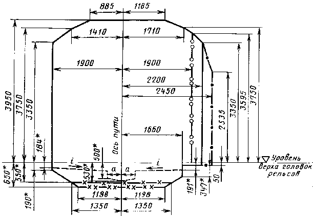 2.2.  Габарит  приближения   строений (черт.1) установлен для прямых участков пути и кривых радиусом 200 м и более, расположенных в тоннелях кругового   очертания диаметрами 5100-5200 мм.