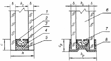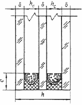 1 ѕ стекло; 2 — распорная рамка; 3 — влагопоглотитель; 4 — нетвердеющая мастака; 5 ѕ вулканизирующийся герметик; 6 ѕ воздушная прослойка; 7 — дегидратационная щель; 8 ѕ обрамляющая рамка; d ѕ толщина стекла; h ѕ толщина стеклопакета; hp ѕ толщина стеклопакета с обрамляющей рамкой; hc ѕ расстояние между стеклами; с — ширина герметизирующего слоя; ср ѕ ширина полки обрамляющей рамки