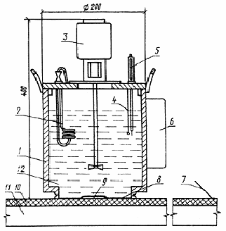 2.2. Прибор состоит из: сосуда из органического стекла диаметром 200 мм с дном из полиэтиленовой или полиамидной пленки толщиной 0,1 мм; трубчатого электронагревателя (ТЭН) мощностью 500-2000 Вт; электромешалки (мощность электродвигателя 20-60 Вт, частота вращения 1300-2600 об/мин); электроконтактного термометра по ГОСТ 9871-75; терморегулятора; двух стандартных хромель-алюмелевых (ТХА) или хромель-копелевых (ТХК) термопар по ГОСТ 6616-74 (градуировка по ГОСТ 3044-77), соединенных последовательно так, чтобы образовать дифференциальную термопару (допускается применение нестандартных медь-константановых термопар при условии их индивидуальной градуировки в установленном порядке).