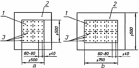 4.5 Перед испытанием поверхность опытного участка или участка реального пола из однородного материала условно делят на 4, а из неоднородного материала — на 6 равных частей (зон), в которых проводят испытания. В каждой зоне намечают 7-9 точек приложения ударов. Точки приложения ударов располагают на расстоянии 60-80 мм между ними и не менее 40 мм от краев участка (рисунок 2а, б).