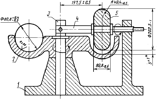 Форму-конус с центрирующим устройством 5, обеспечивающим точную установку формы на диске столика и предохраняющим ее от смещения в процессе штыкования раствора, и насадку 6 изготовляют из коррозионно-стойких материалов; их основные размеры приведены на черт.2.