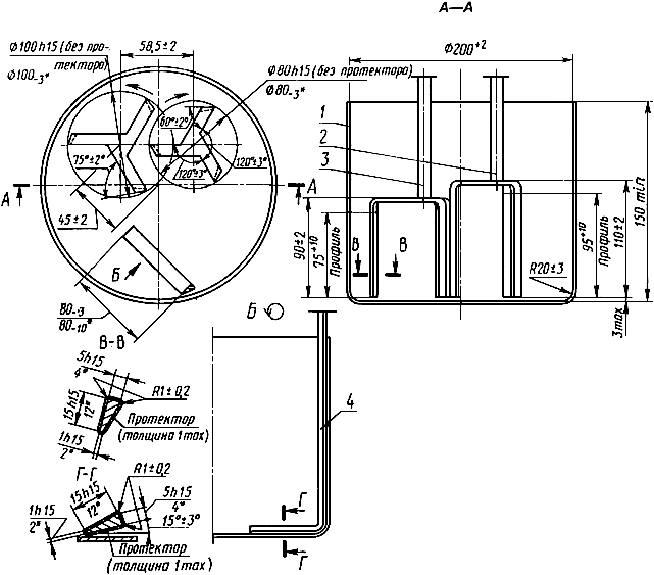 1а. Для перемешивания цементного раствора применяют лопастную мешалку. Ее схема, взаимное расположение, размеры и предельные отклонения размеров лопастей и чаши приведены на черт.1а.