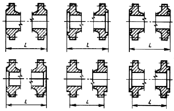 Строительные длины L фланцевых задвижек на РN 2,0; 5,0; 6,3; 10,0 МПа (20, 50, 63, 100 кгс/см2) и выше должны соответствовать указанным на черт. 2, 3, 4 и в табл. 1.