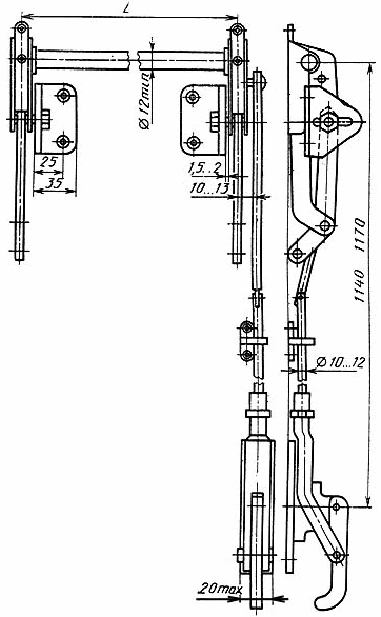 — фрамужные приборы типа ПФ2, устанавливаемые на фрамуги с тройным остеклением, — двумя ограничителями и двумя соединителями (черт. 6 и 7);