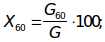 Содержание зерен размером более 70 мм (Х70); 60 мм (Х60); 40 мм (Х40); 25 мм (Х25); 5 мм (Х5) и размером менее 25 мм (Х-25); 5 мм (Х-5); 0,16 мм (Х-16) в процентах вычисляют по формулам: