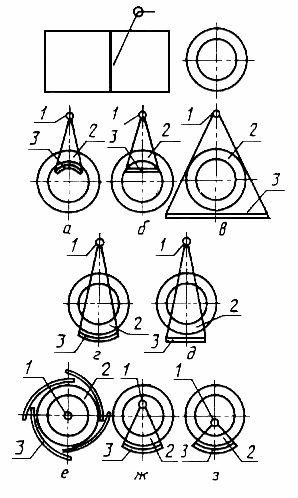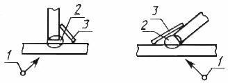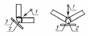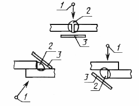 | 3. ПОДГОТОВКА К КОНТРОЛЮ 3.1. Радиографический контроль следует проводить после устранения обнаруженных при внешнем осмотре сварного соединения наружных дефектов и зачистки его от неровностей, шлака, брызг металла, окалины и других загрязнений, изображения которых на снимке могут помешать расшифровке снимка. 3.2. После зачистки сварного соединения и устранения наружных дефектов должна быть произведена разметка сварного соединения на участки и маркировка (нумерация) участков. 3.1, 3.2. (Измененная редакция, Изм. № 1). 3.3. Систему разметки и маркировки участков устанавливают технической документацией на контроль или приемку сварных соединений. 3.4. При контроле на каждом участке должны быть установлены эталоны чувствительности и маркировочные знаки. 3.5. Эталоны чувствительности следует устанавливать на контролируемом участке со стороны, обращенной к источнику излучения. 3.6. Проволочные эталоны следует устанавливать непосредственно на шов с направлением проволок поперек шва. 3.7. Канавочные эталоны следует устанавливать на расстоянии не менее 5 мм от шва с направлением канавок поперек шва. 3.8. Пластинчатые эталоны следует устанавливать вдоль шва на расстоянии не менее 5 мм от него или непосредственно на шов с направлением эталона поперек шва так, чтобы изображения маркировочных знаков эталона не накладывались на изображение шва на снимке. 3.9. При контроле кольцевых швов трубопроводов с диаметром менее 100 мм допускается устанавливать канавочные эталоны на расстоянии не менее 5 мм от шва с направлением канавок вдоль шва. 3.10. При невозможности установки эталонов со стороны источника излучения при контроле сварных соединений цилиндрических, сферических и других пустотелых изделий через две стенки с расшифровкой только прилегающего к пленке участка сварного соединения, а также при панорамном просвечивании допускается устанавливать эталоны чувствительности со стороны кассеты с пленкой. 3.11. (Исключен, Изм. № 1). 3.12. Маркировочные знаки, используемые для ограничения длины контролируемых за одну экспозицию участков сварных соединений, следует устанавливать на границах размеченных участков, а также на границах наплавленного и основного металла при контроле сварных соединений без усиления или со снятым усилением шва. 3.13. Маркировочные знаки, используемые для нумерации контролируемых участков, следует устанавливать на контролируемом участке или непосредственно на кассете с пленкой так, чтобы изображения маркировочных знаков на снимках не накладывались на изображение шва и околошовной зоны по п. 5.7. 3.14. При невозможности установки эталонов чувствительности и (или) маркировочных знаков на контролируемом участке сварного соединения в соответствии с требованиями настоящего стандарта порядок проведения контроля без установки эталонов чувствительности и (или) маркировочных знаков должен быть предусмотрен в технической документации на контроль или приемку сварных соединений. (Измененная редакция, Изм. № 1). 4. СХЕМЫ КОНТРОЛЯ 4.1. Сварные соединения следует контролировать по черт. 4 и 5. Схемы контроля стыковых, нахлесточных, угловых и тавровых соединений    1 — источник излучения; 2 — контролируемый участок; 3 — кассета с пленкой Черт. 4 Схемы контроля кольцевых (стыковых, нахлесточнхы, угловых и тавровых) сварных соединений  1 — источ