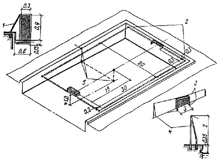 6.10. Для освещения залов ванн (с местами для зрителей или без них) при высоте зала 8 м и менее рекомендуется применять систему верхнебокового освещения с установкой светильников на боковых стенах и потолке за пределами зеркала воды. Наиболее качественной системой освещения является система отраженного света, но она наименее экономична. При установке светильников на потолке зала необходимо обеспечивать защитный угол не менее 40° в продольной и поперечной плоскостях.